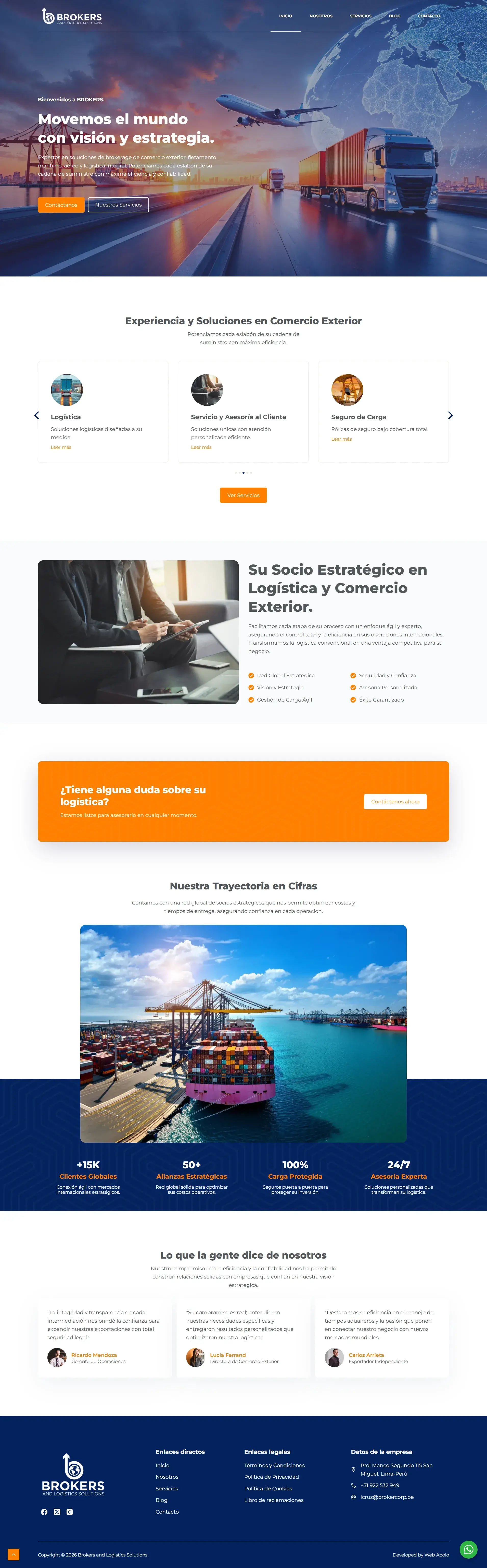 El sitio presenta un diseño personalizado, moderno y profesional, totalmente responsive, garantizando una visualización óptima. La estructura destaca su experiencia en el sector mediante secciones de servicios, indicadores de trayectoria (cifras clave) y testimonios de clientes. El desarrollo integra un blog estratégico para la publicación de noticias y tendencias de logística, reforzando su autoridad en el mercado. Es una herramienta corporativa eficiente que utiliza llamados a la acción claros para facilitar el contacto y la captación de nuevos socios estratégicos.