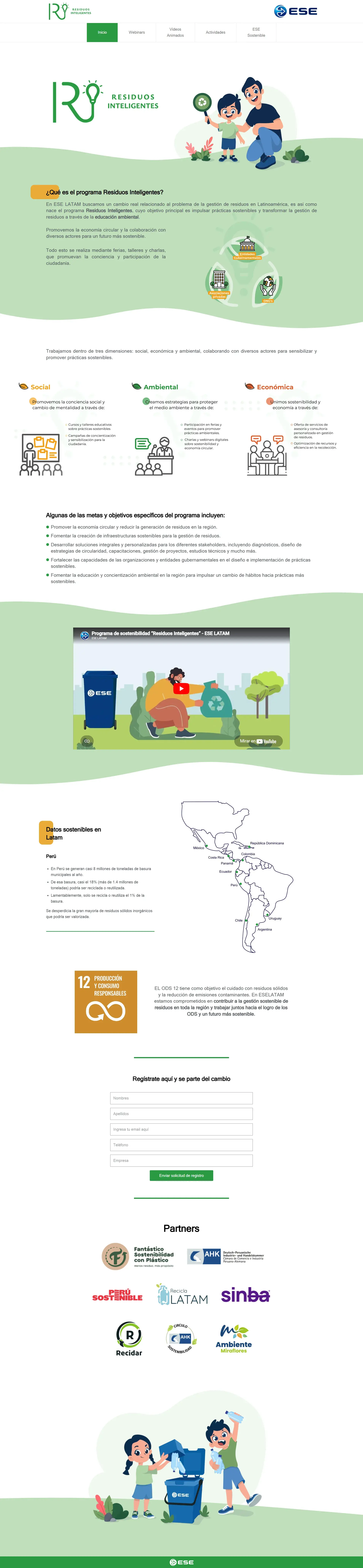 El desarrollo web se realizó con diseño personalizado, estructura responsive y uso de Custom Fields para una gestión de contenido flexible. La plataforma está enfocada en la educación sobre sostenibilidad, integrando un canal de YouTube para la difusión de webinars, contenidos sobre economía circular y una sección tipo blog con actividades filtradas por países, facilitando el acceso a información relevante según la región.